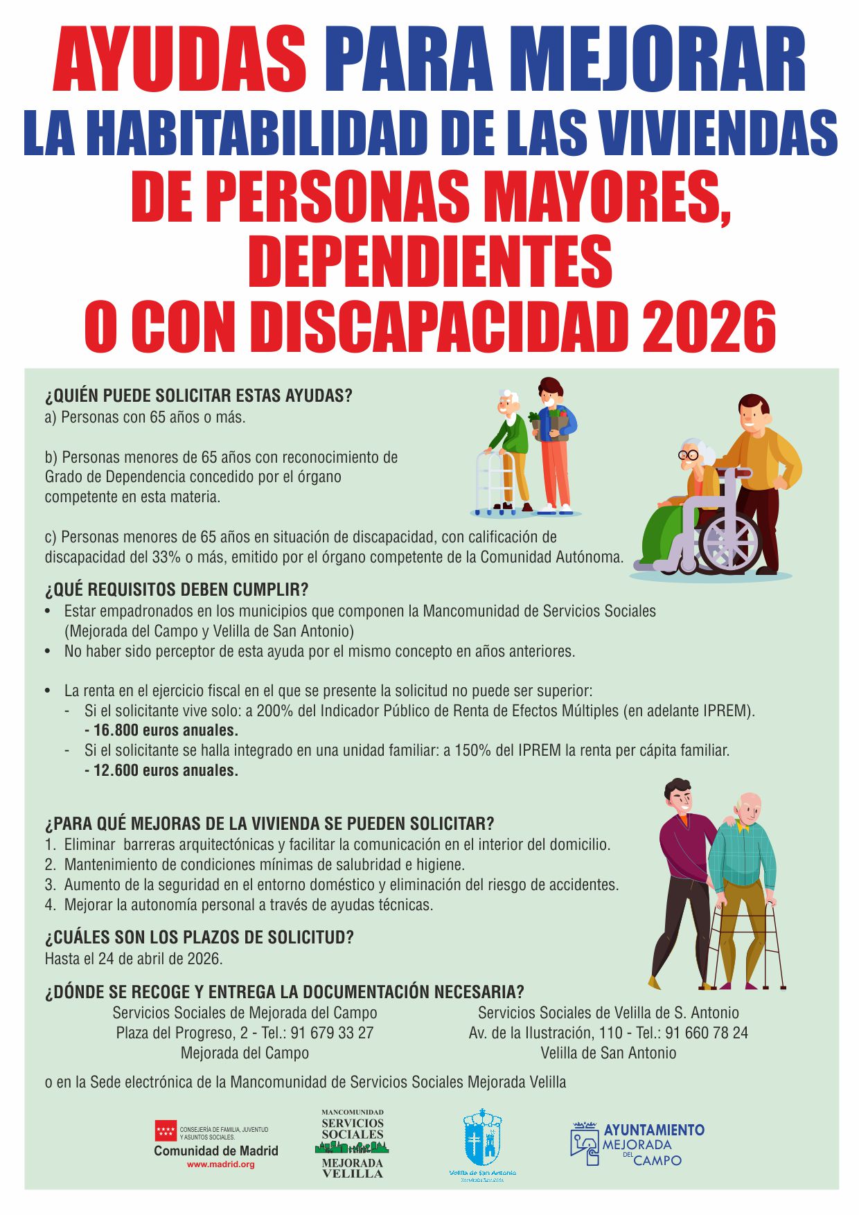 – Estar empadronados en los municipios que componen la Mancomunidad de Servicios Sociales (Velilla de San Antonio o Mejorada del Campo).