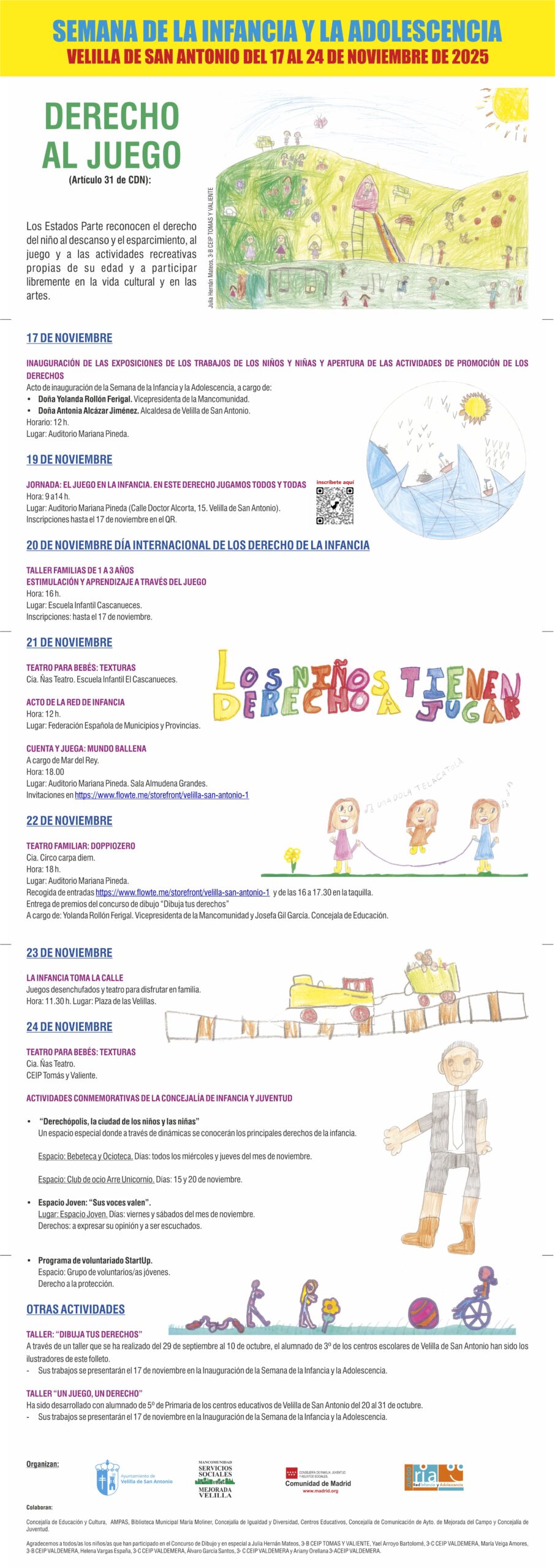 Como cada año, el Ayuntamiento de Velilla de San Antonio, a través de la concejalía de Servicios Sociales y la Mancomunidad de Servicios Sociales organiza durante el mes de noviembre la Semana de la Infancia y Adolescencia.