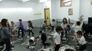 Juegos musicales con papeles de periódicos, descubrimiento de diferentes instrumentos, y después de la cena, la gymkana musical.